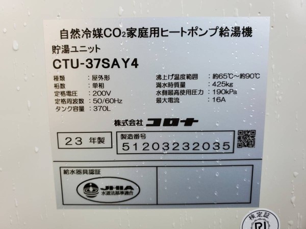 北谷町 コロナ自然冷媒CO2家庭用ヒートポンプ給湯機 貯湯ユニットCTU-37SAY4 給湯器交換工事