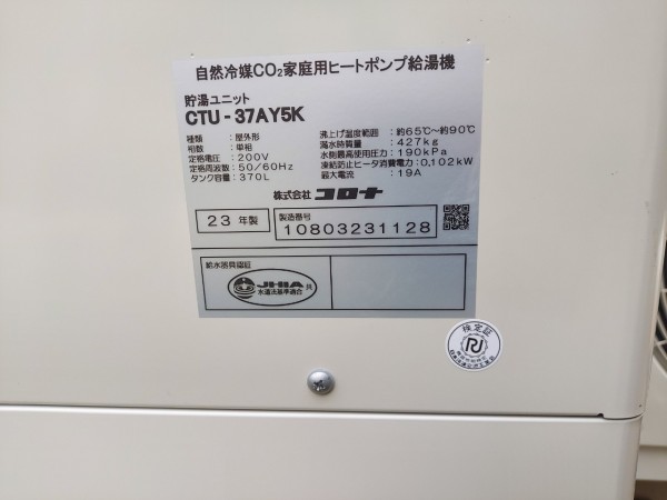糸満市 コロナ自然冷媒CO2家庭用ヒートポンプ給湯機貯湯ユニットCTU-37AY5K エコキュート交換工事