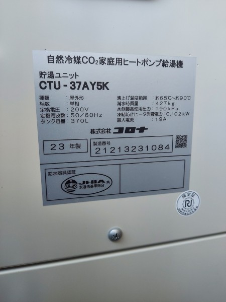 那覇市牧志 コロナ自然冷媒CO2家庭用ヒートポンプ給湯機貯湯ユニットCTU-37AY5K エコキュート交換工事