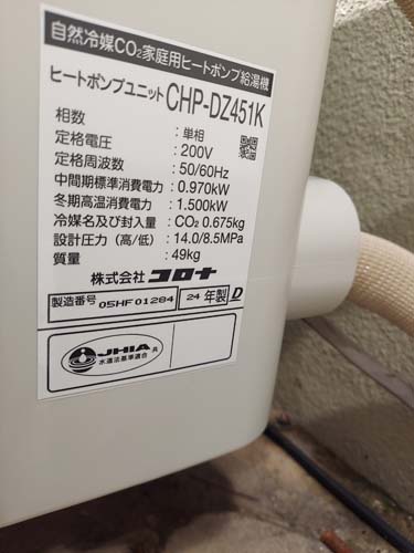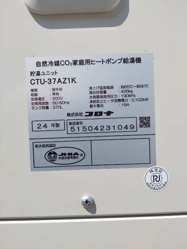 島尻郡与那原町与那原 コロナ自然冷媒CO2家庭用ヒートポンプ給湯機 貯湯ユニットCTU-37AZ1K、ヒートポンプユニットCHP-DZ451K エコキュート交換工事