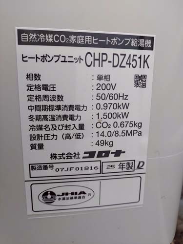 石垣市大川 コロナ自然冷媒CO2家庭用ヒートポンプ給湯機 ヒートポンプユニットCHP-DZ451K エコキュート交換工事|沖縄県でエコキュート交換工事・取り付け・補助金申請なら|沖縄エコキュート交換工事センター