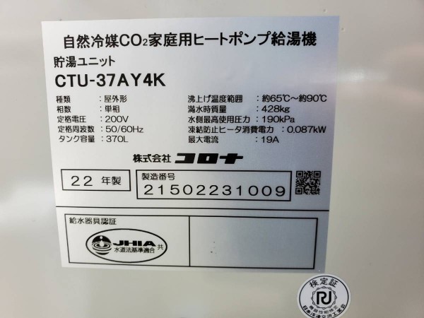 東村 コロナ自然冷媒CO2家庭用ヒートポンプ給湯機貯湯ユニットCTU-37AY4K 給湯器交換工事